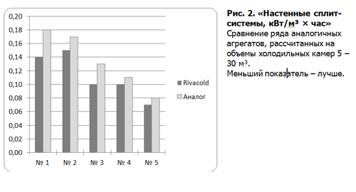 Что касается холодильного оборудования, то инженеры завода Rіvacold сумели сбалансировать конструкцию своих агрегатов таким образом, чтобы получать максимальную холодопроизводительность при минимальном энергопотреблении. Как энергоэффективность холодильного оборудования влияет на Вашу прибыль? В условиях ежегодно растущего дефицита энергоресурсов и роста цен на энергоносители мировое сообщество ищет любые пути сокращения энергопотребления и потерь энергии при ее передаче от производителя к потребителю. В целом подобные программы выполняются в рамках повышения энергоэффективности промышленного и бытового оборудования и технологических процессов при сокращении энергопотребления. В прикладном смысле энергоэффективность можно определить как возможность получить больший положительный эффект от работы оборудования при меньших энергозатратах. Инженерное решение в холодильным оборудовании компании Rіvacold представляет собой сложный и уникальный баланс мощности и типа компрессора, объема и площади конденсатора, системы испарения и схемы автоматики, что в конечном итоге гарантирует существенное повышение энергоэффективности. Сравнительный анализ показывает, что удельный показатель расхода электроэнергии на единицу охлаждаемого объема (кВт/м³ × час) ниже – у агрегатов марки Rіvacold, чем у аналогичных агрегатов итальянского производства при прочих равных условиях. Это означает, что агрегаты Rіvacold, для достижения требуемой температуры расходуют меньше электроэнергии, чем аналоги.